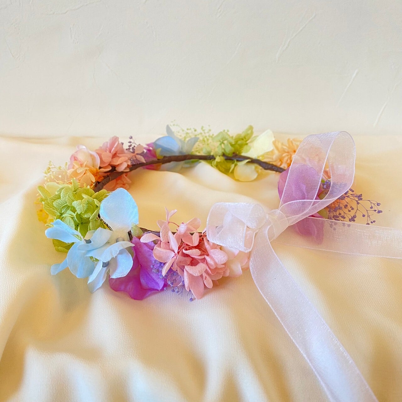 【パステルカラーの子供用花冠】プリザーブドフラワー サイズ調整可能なリボン付き